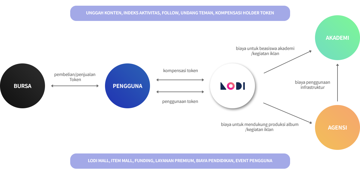 Token dapat ditukar melalui bursa, dan pengguna LODI dapat menggunakan layanan funding untuk mendukung pengembangan dan debut artis, layanan iklan/perdagangan untuk membayar/membeli artis MD, dan layanan akademi untuk membantu pengguna umum berpendidikan musik secara keseluruhan.