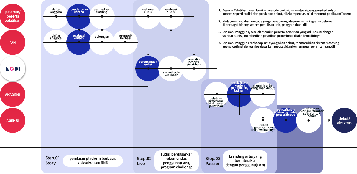 Artis yang dinilai tinggi oleh FAN, mendapatkan kesempatan untuk mengikuti audisi di LODI dan peserta pelatihan yang terpilih akan menerima pelatihan sistematis di Akademi LODI. Setelahnya mereka dapat debut dan mulai bergerak dengan dibantu agen mitra. Artis dapat mengunggah konten-konten(latihan, pendidikan, kehidupan sehari-hari, dll) yang dibuat dalam kurikulum pelatihan di LODI, atau dapat membentuk fandom dengan komunikasi berkelanjutan dengan FAN melalui siaran langsung, kegiatan komunitas, dsb.